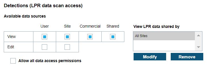 Site managers are able to set the Detections (LPR data scan access) and limit the view of detections available.