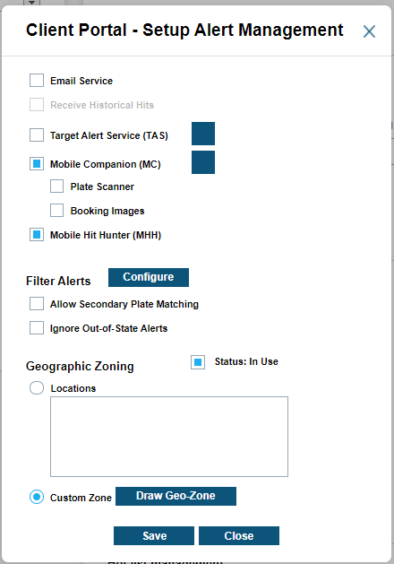 Target Alert Service allows you to instantly receive alerts at their terminal, simliar to the alert screen of Vigilant CarDetector. This tool allows for fast response to alerts in a realtime alerting environment. There is an option to download this tool and connect to the ClientPortal Server with it. See Software Downloads for more information. Mobile Hit Hunter (MHH) allows the consumption of Contributed Data within Mobile LPR camera system. Client Portal has ability to turn on/off alerts for MHH as needed through the Filter Alerts section.
