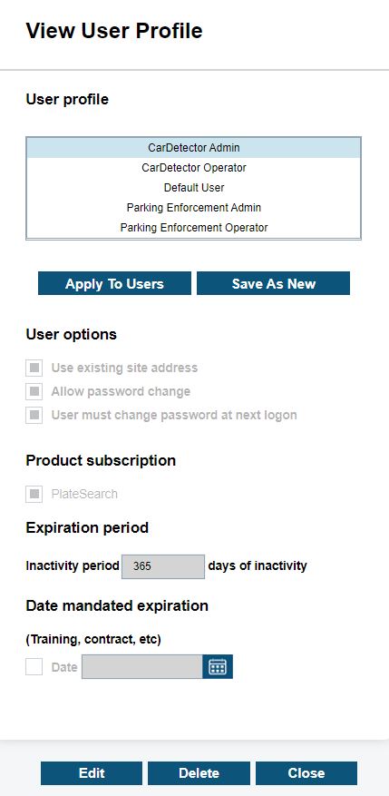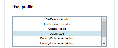 If you will be using a License Plate Recognition (LPR) system, Client Portal can set the LPR system use. The site manager can choose between CarDetector Admin, CarDetector Operator, CDFS (CarDetector Fixed system) Admin, CDFS Operator, CDMS (CarDetector Mobile system) Admin, and CDMS Operator.