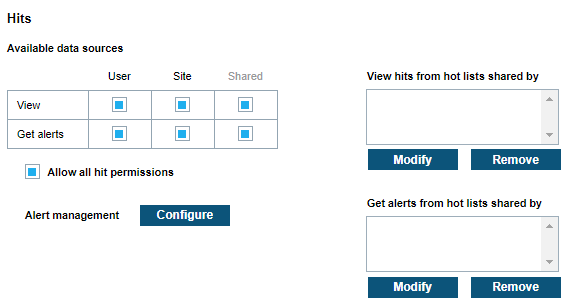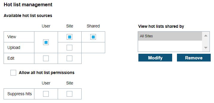 Site Managers can also give access to Hot-Lists that have been shared by other sites. If access to shared hot-lists is selected, best practices dictate that the Site Manager also select from the list of available sharing sites. Users are only able to Edit hot-lists within the User and Site data pools. Shard hot-lists cannot be edited.