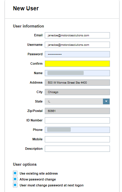 When you create a new user, you will be required to enter all the required fields (Username, Password, Name, Address, City, State, Zip, Phone, and Email). You can add more user information as desired (Badge, Mobile, and Description). You can prepopulate the user address with the site address by selecting the Use Existing Site Address option. A site manager can also allow the right for the user to change their password underneath their My Profile section by checking Allow Password Change. You can control your own alert management for emails and Target Alert Service (TAS).