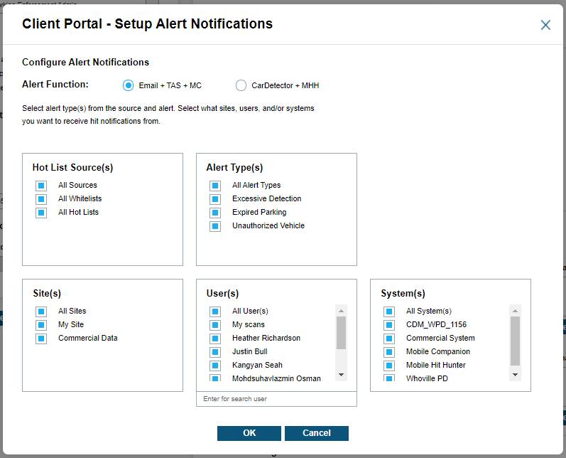 There are a total of three alert types available: TAS (Target Alert system), E-mail, and Mobile hit-Hunter. These three alerts can be turned on and off for a user Hot List, a Site Hot List, or a Shared Hot List. When selecting Shared data, best practices dictate that the Site Manager select from the list of available sharing sites.