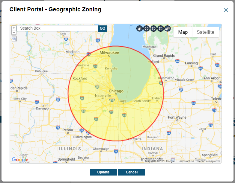 Geographic Zoning allows you to define the exact perimeter that they will be notified for. To use the polygon drawing tool, use the Google Map zooming tools in upper left corner to zoom-in on region to select. Next, select the Polygon icon in lower left corner to begin polygon creation. Generate polygon selection by Left-clicking on the map with at least three points. To reset the zone, click Clear, and draw again. You can add multiple zones by clicking Add. Click Save to save the zone and click Update.