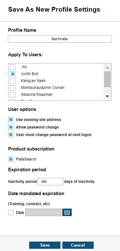 If Apply to users is selected, the user Permissions and Profile Name will not be editable, but can be assigned to a user list in the users table. Once the desired users have been selected, you can select Save to apply profile to users selected, or Cancel to dismiss changes.