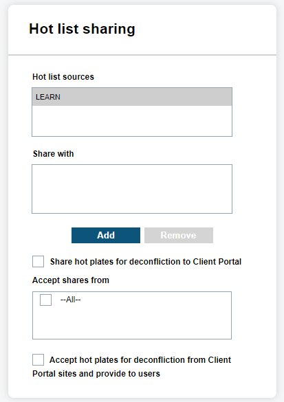 Within Hot List Sharing by Site, the site manager can choose a site and Hot List Source to Share. First, you will select the site you wish to share with. After selecting the site, you must choose a Hot List Source to share.You must individually select each site and corresponding Hot List Source to share. Likewise, you can remove or edit a Hot List Source share by highlighting the intended site and selecting Remove or New Hot List Source respectively. To accept shares, simply select the sites that you wish to accept shares from. To automatically accept Hot List shares, select --All-- and new Hot Lists will be automatically available to users. When finished selecting the Site Detection and Hot List Shares, you must select Update before the changes will take effect. You will be prompted to update if you navigate away prior to saving changes.