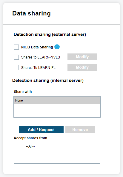 The site manager can also enable LPR detection sharing to internal sites under Detection Sharing (Internal Server). Site managers can add specific sites to share their detection data with by selecting Add/Request and selecting a check box for each site they wish to share their data with. If the site manager wishes to remove a site from their Share, they can select the site by highlighting it and clicking Remove. To accept shares from internal sites, simply select the sites that the user wishes to accept shares from in the Accept Shares From: box. To automatically accept detection shares, select All and detection Shares will be automatically available to users.