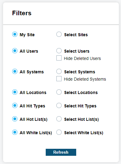 Beyond Activity Search, you also has the ability to control filters for Site, User, System, and Hot Lists. You are able to turn off individual filter components by simply unchecking each Site, User, System, or Hot List listed.