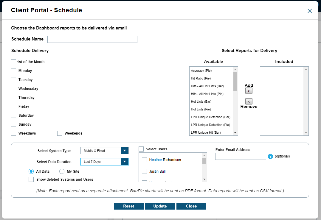 Once the schedule has been selected, you can configure the Select Reports for Delivery. The left column will list the Available reports while the right column will show the Included reports. To add or remove reports, simply highlight the desired report and click Add or Remove button. Lastly, you will need to specify the System Type and Data Duration. Finally, while setting up scheduled reports by email, you will be prompted to input an email address for the recipient of the report. Multiple email addresses can be entered and separated by a semicolon. Once the changes are complete, select Update to save your changes and Start to begin receiving the Scheduled Reports.