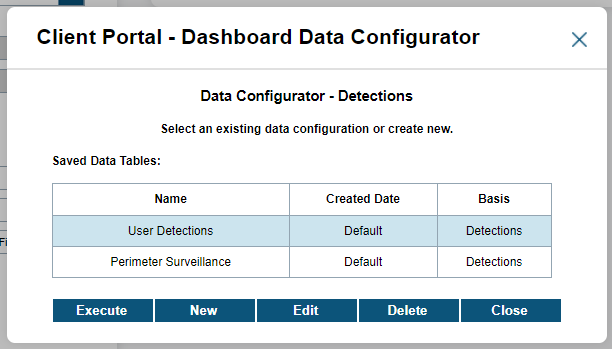 To Configure the table to output different X-axis and Y-axis fields, you can select the Configure button. You will be presented with Saved Tables, which will state the Name, Created Date, and Basis. The Basis is dictated by the Type that was originally selected in the Data Contribution View selection (Detections or hits). The Default table is uneditable, and you will want to select New to create a new Table View. Once a new table has been configured, you can Edit or Delete the Table View. Also, you can Execute the search of the saved Table View.