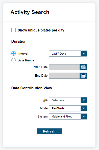 The Data Contribution View allows you to set the Type, Mode, and System. For Type, you can choose between Detections or hits. For Mode, you can choose between Pie Charts, Bar Graphs, or Data View. The Data View lists the statistics under each system and user for the dates selected. Lastly, the System option will allow you to choose between Mobile, Fixed, or Mobile and Fixed system types.