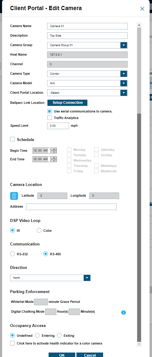 Camera Controls is based on your LPR camera type and will allow you to control hardware settings when connected through RS232 or RS485 cable. It is recommended to keep the defaults setting.
