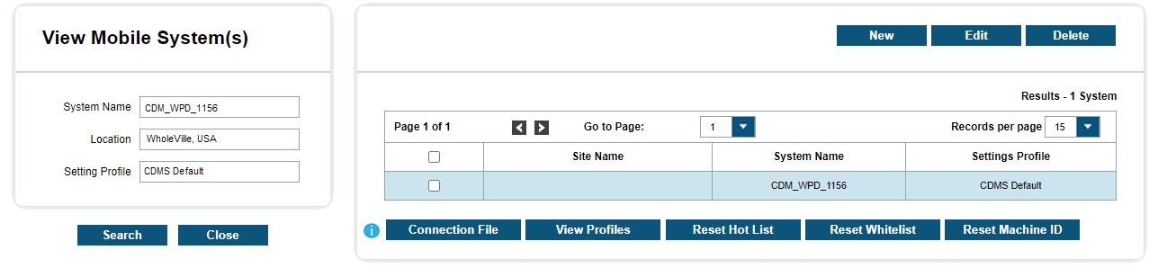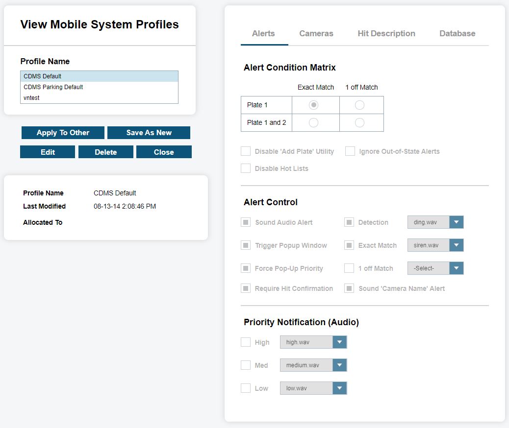 To view and edit system profiles, select the View Profiles option at the bottom of the table listing for mobile systems. From there, you will be presented with the option to apply the selected profile to other systems using the Apply To Other button. Once the system is selected, simply select Apply to push settings to the vehicle. The CDMS Default profile cannot be edited. Instead, you must select Save As New to generate a new system profile from the CDMS Default settings. You will then be prompted to enter a new profile name. Once renamed, select Apply To Systems and you can select the systems desired.