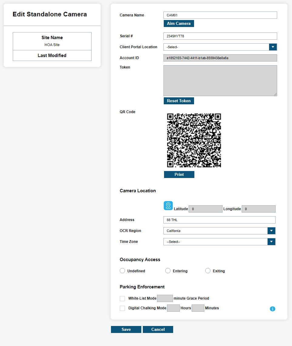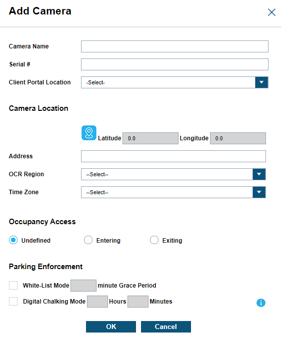 In the Camera Location section, the pin icon can be used to search for an address to automatically complete the Latittude, Longitude, Address and Time Zone fields. The OCR Region is generally the state/territory that the address is in.