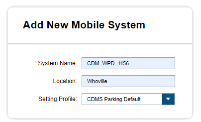 To create a new system, select the New button above the table. This will take you to the following that allows you to insert a System Name, Location, and select a Setting Profile. A typical System Name would be the type of system (CDM vs. CDF) followed by an agency acronym and vehicle number. Something that is unique and defining is recommended. LOCATION is not a required field but can be useful when dealing with multiple locations. The Setting Profile allows you to choose the default profile or from custom-made profiles. You can start with CDMS Default profile and alter later. To delete a system, simply highlight the desired system select Delete. You will be prompted to confirm.