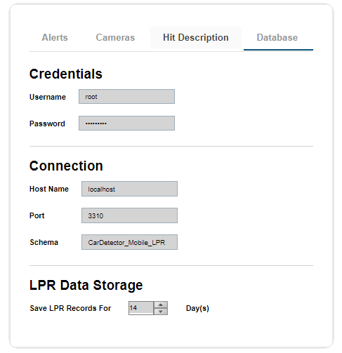 The Database tab will show Credentials, Connection, And LPR Data Storage options. The Credentials for the local LPR database are not currently configurable now. The Connection is not currently remotely configurable for Host Name nor Port. The Schema can be altered to specify a new database name. This can have the effect of wiping a system clean in the case of corrupt database, performance issues, or out-of-synch Hot Lists. It is recommended keeping default schema name. Lastly, you can configure the LPR Data Storage, which controls the retention policy for detection CarDetector records. Records that are older than the specified retention policy will be purged from LPR. This is acceptable as all detections should be uploaded to the system for archival purposes. The minimum is one day, and the maximum is 719 days.