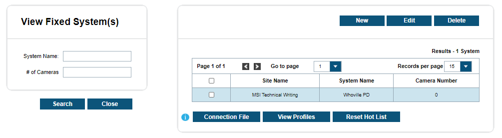 When viewing fixed systems, you can select System Name or # of Cameras to filter through different systems. To the right of the filters, will be a list of current systems associated with the site. The table will list the Site Name, System Name, and Camera Number that is associated with the system. Traditional page navigation is used in the case of having more than 15 systems within the site.
