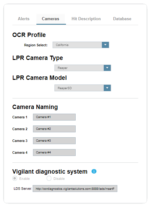 The Cameras tab allows for the selection of OCR Profile, LPR Camera Type, Camera Naming, and Camera Controls. The OCR Profile allows you to choose Region Select for the region that the Vigilant CarDetector will be operating in. Because license plate design differs from state to state, the system uses Optical Character Recognition (OCR) algorithms that are unique to each region. To increase capture and character recognition, you will want to select the region that most closely resembles the plates being captured. The LPR Camera Type will allow for the selection between our two types of camera styles, which are the older C-Series cameras and the newer Raptor LPR cameras. Like regional options, choosing the correct style of camera will allow for optimum capture rates because our algorithms are designed around the video collected on the different hardware.