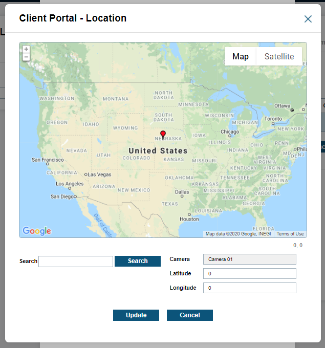 When using the Camera Location configuration tool to input GPS coordinates, you will be presented with a pop-up that uses a Google Maps API. In the Search section, you can put in an address of the location of the camera. You can use the map to move the pin to an exact location. Once moved, the Latitude and Longitude will be dynamically updated. If needed, these coordinates can also be updated manually to the needed accuracy. After editing, click Update and Close to save coordinates.