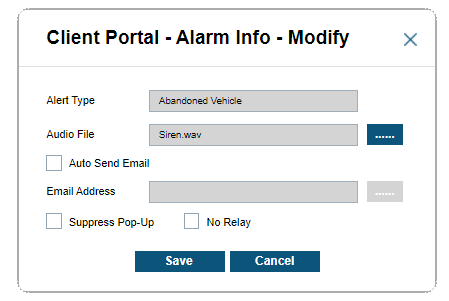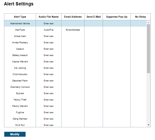 The Alarms tab allows for the input of Alert Settings and Custom Alert Fields. When configuring Alert Settings, you will first highlight the Alert Type you wish and select Modify. An Alarm Info window pop-up will allow the user to configure the Audio File from the default sound files. A drop-down box with each default alarm on CDFS will be included in dropdown box.