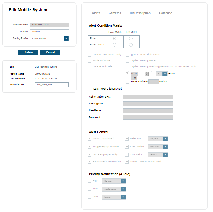 Once a CarDetector Mobile System (CDMS) has been created, you can edit the selected system and change the location or CDMS profile. On the right, you will see the values listed with the Setting Profile that is selected. It will list the Site, Profile Name, Last Modified date, and other systems that the profile is allocated to. The alerts tab will list the Alert Condition Matrix, Alert Control, and Priority Notification for audio alerts.
