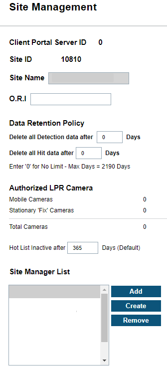 The site manager can set the number of days to retain the site detection data and/or hit data. The default is ‘0’ which is unlimited data retention. Site managers are also allowed to add, create, or remove other site managers for their site.