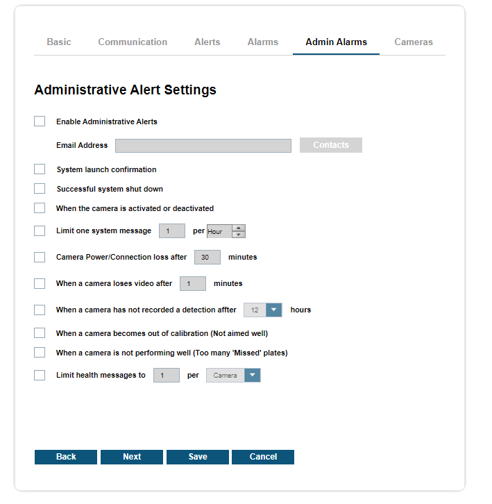 With the Admins Alarms tab, you can control all aspects of the Administrative Alert Settings. You can enable email alerts to a specific email address or from a contact list by selecting the Contacts button. Once configured for an address, you have the option to be notified when the System launches, gracefully shuts down, or when cameras become activated or deactivated. You can limit these System messages to X per minute/hour. Also, you can be notified when a camera loses power after X minutes or when a camera loses video after X minutes. You can also be notified when no detections have been recorded after X hours or if the camera is out of calibration. Lastly, you can be notified when too many missed plates are received. Finally, you can limit your health messages to X per X cameras.
