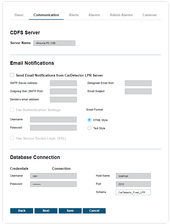 The Communication tab includes the CDFS Server, Email Notifications, and Database Connection. Email Notifications allows the configuration of emails to be sent directly from CDFS to specific users and CDFS Administrators. This is done by porting to an SMTP Server or SMTP Relay Server using credentials from your IT Administrator. There are the options to use Secure Socket Layer (SSL) and output in HTML or text. The Database Connection is not currently remotely configurable for Username, Password, Host Name nor Port. However, the Schema name can be altered to specify a new database name. This can have the effect of wiping a system clean in the case of corrupt database, performance issues, or out-of-sync Hot Lists. It is recommended to keep the default schema name unless troubleshooting.