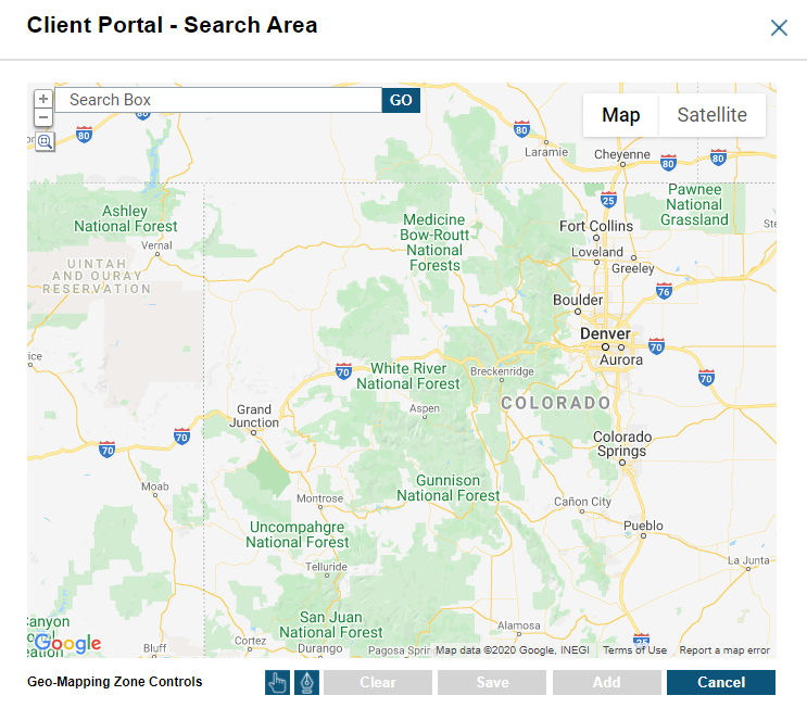 To use the polygon drawing tool, use the Google Map zooming tools in upper left corner to zoom-in on region to select. Next, select the Polygon icon to begin polygon creation. Generate polygon selection by left-clicking on the map with at least three points. To reset the zone, click Clear, and draw again. You can add multiple zones by clicking Add. Click Save to save the zone and click Update.