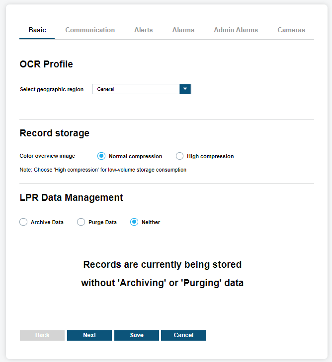 For the Basic tab, you can configure the Optical Character Recognition (OCR) Profile, Record Storage and Vigilant CarDetector Data Management. The OCR Profile allows the user to choose select geographic region for the region that the Vigilant CarDetector will be operating in. Because license plate design differs from state to state, the system uses OCR algorithms that are unique to each region. To increase capture and character recognition, you will want to select the region that most closely resembles the plates being captured. When selecting the OCR Profile, you will also want to choose between the Raptor camera profiles or the traditional camera settings. Record Storage allows for the choice between Normal Compression and High Compression for the color overview image. Depending on storage capacity, this will dictate the best compression option.