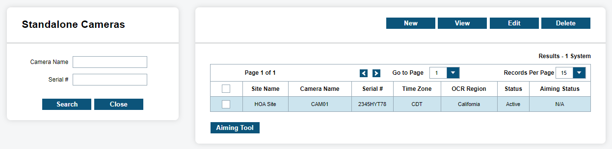 As a site manager, you are able to view, create, edit, and delete Standalone Cameras. Standalone cameras are self-contained systems that operate without an attached LPR system. When viewing the Fixed systems, you may enter a camera name or serial number and click Search to filter through different systems. To the right of the filters, will be a list of current systems associated with the site. The table will list the Site Name, Camera Name, and Serial Number that is associated with the camera along with region and status information. Traditional page navigation is used in the case of having more than 15 systems within the site.