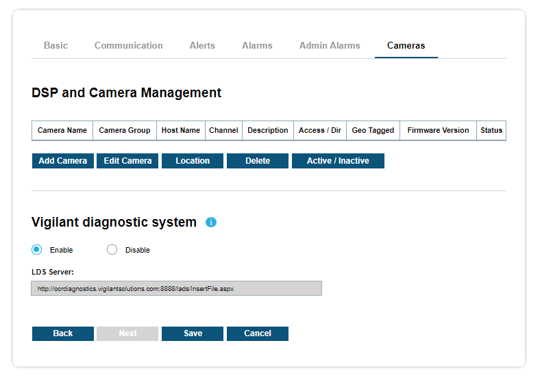 The Cameras tab allows managers to modify camera settings, activate, deactivate, and view the current configuration. Within DSP and Camera Management, you will find the Camera Name, Camera Group, Host Name, Channel, Description, Access/Direction, Geo Tag flag, Firmware Version, and Status. To activate a camera, simply highlight desired inactive camera and click on Active. To deactivate camera, simply highlight desired active camera and click on Deactivate.