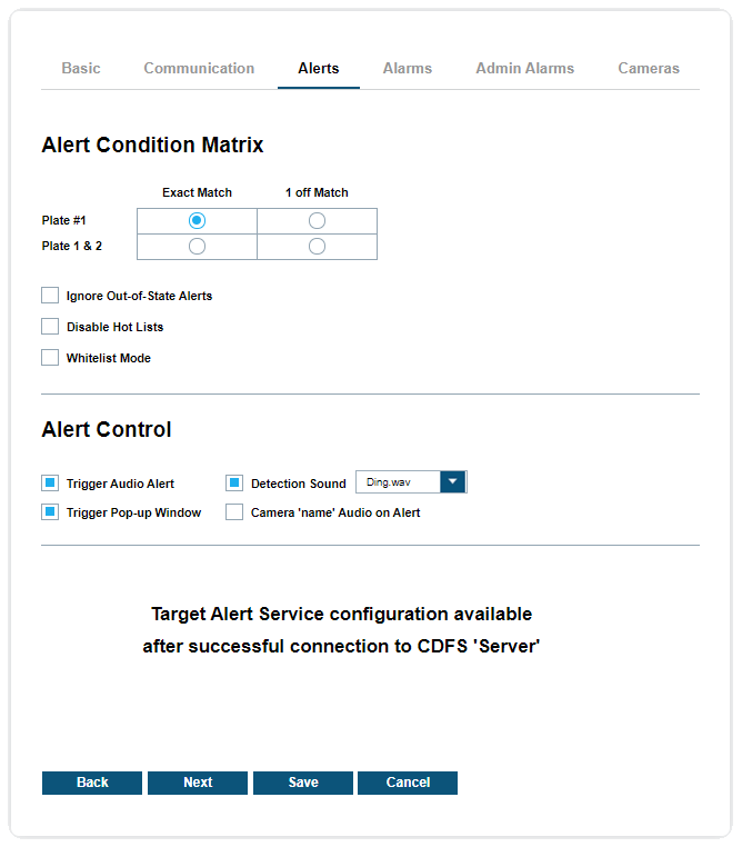 Next, the Alert tab is used for configuration of the Alert Condition Matrix, Alert Control and Target Alert Service (TAS). The details of these configurations are already explained in CarDetector Mobile Systems Configuration.