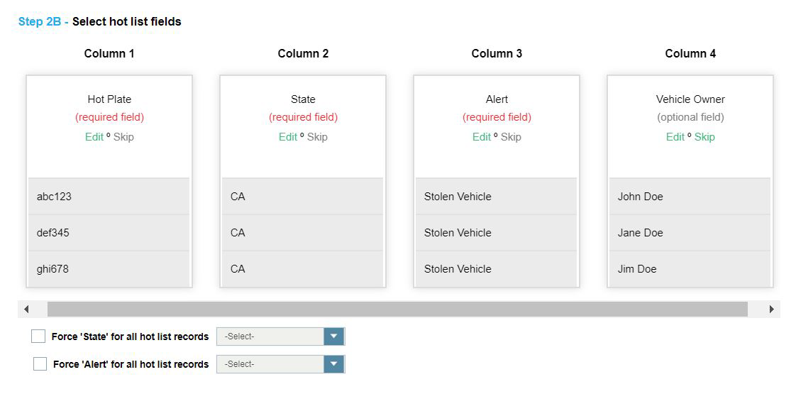 Hot Plate, State, and Alert are all the required fields. This means, ClientPortal must use the required fields in order to load the file. If ClientPortal does not have a State or Alert field, ClientPortal can define them manually from the following drop-down boxes. Each record in the Hot List will be assigned the value defined. If the Alert is not available in the drop-down box, a new Alert name can be created.