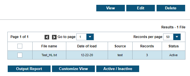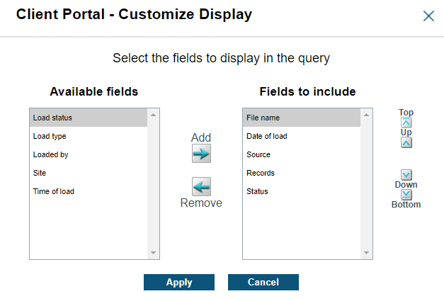 Once you are finished Entering the Filters and Time Period, you can select Search to populate the table with your results. The table will include File Name, Date of Load, Source, Records, and Status. When you select View, you will be sent to the Search Records section and it will automatically query the records for the selected file. You can customize the output using the Customize View option. The Customize Display pop-up will allow the addition of Site, Load Status, Load Type, Loaded By, and Time of Load to the current table. To add or remove fields to the fields to include, simply highlight the field and select Add or Remove based on the field priority. Likewise, the fields can be moved up and down in the order to display. The top fields will display left to right on the table. Click Apply to save the customize view.