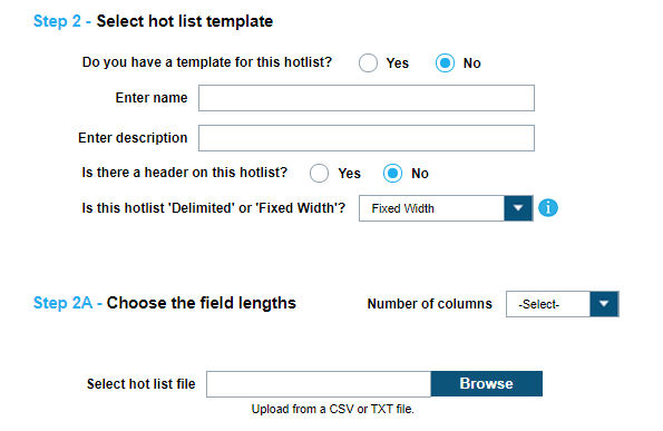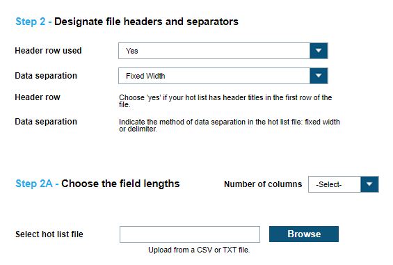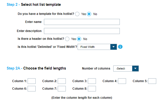 For Fixed Width, you will want to define the field lengths of each column. First, you will choose the number of columns in the Hot List file. From the count selected, you will want to define the length of each. Using a program like Notepad with a Status Bar can help determine the size of each column length. The column lengths must be one or greater (up to 500). If you wish to ignore specific columns, they can be skipped in Step 2B.