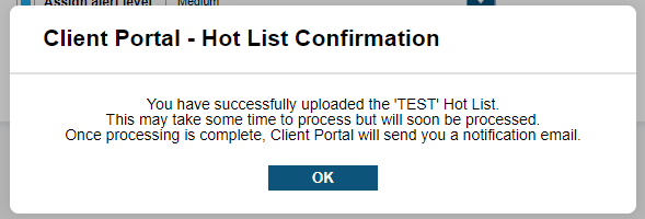 When finished making your decisions, select Upload Hot List, and you will be notified that your Hot List has been successfully uploaded. An email will be sent to the account email that uploaded the Hot List file. The email will confirm what Hot Lists records were successful, duplicates, and failed records. Likewise, you can use the Search Hot List File feature to query the state of the Hot List.