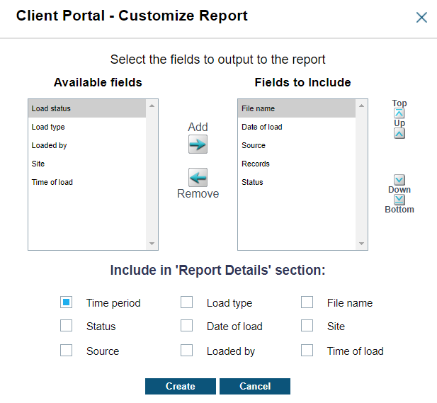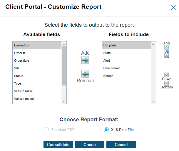 You can Output Report the uploaded files to a report, which will have the option to include and exclude fields. To add/remove fields to the fields to include, simply highlight the field and select Add or Remove based on the field priority. Likewise, the fields can be moved up and down in the order to display. The top fields will display left to right on the report. You will also have the option to consolidate fields at the top of the report by check boxing the fields with common qualities, which remove the redundant columns. When you are ready to output the report, choose the format of report in PDF or XLS, and click Create. You will be prompted for a location to store the report.