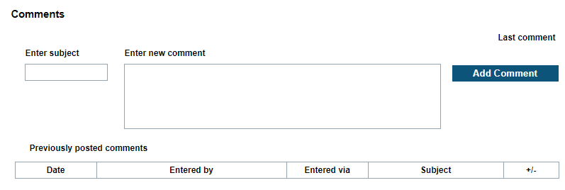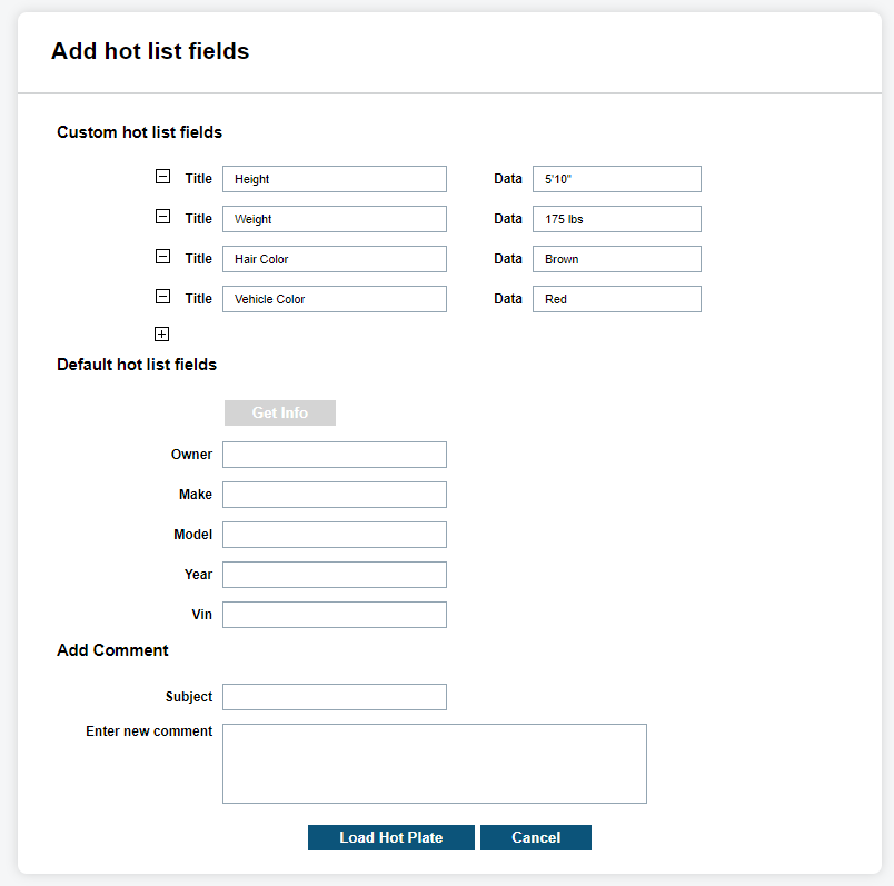 If you scroll to the bottom for Comments, you can append Hot List comments to the bottom of the record. These comments can include descriptions that are not included on the original Hot List record. Enter the Subject and New Comment and click Add Comment. Each comment will appear below the Hot List records in minimized form. You can select + to expand comments. From the Hot Record Detail, you can also select Output Report to generate report or Close to close the window.