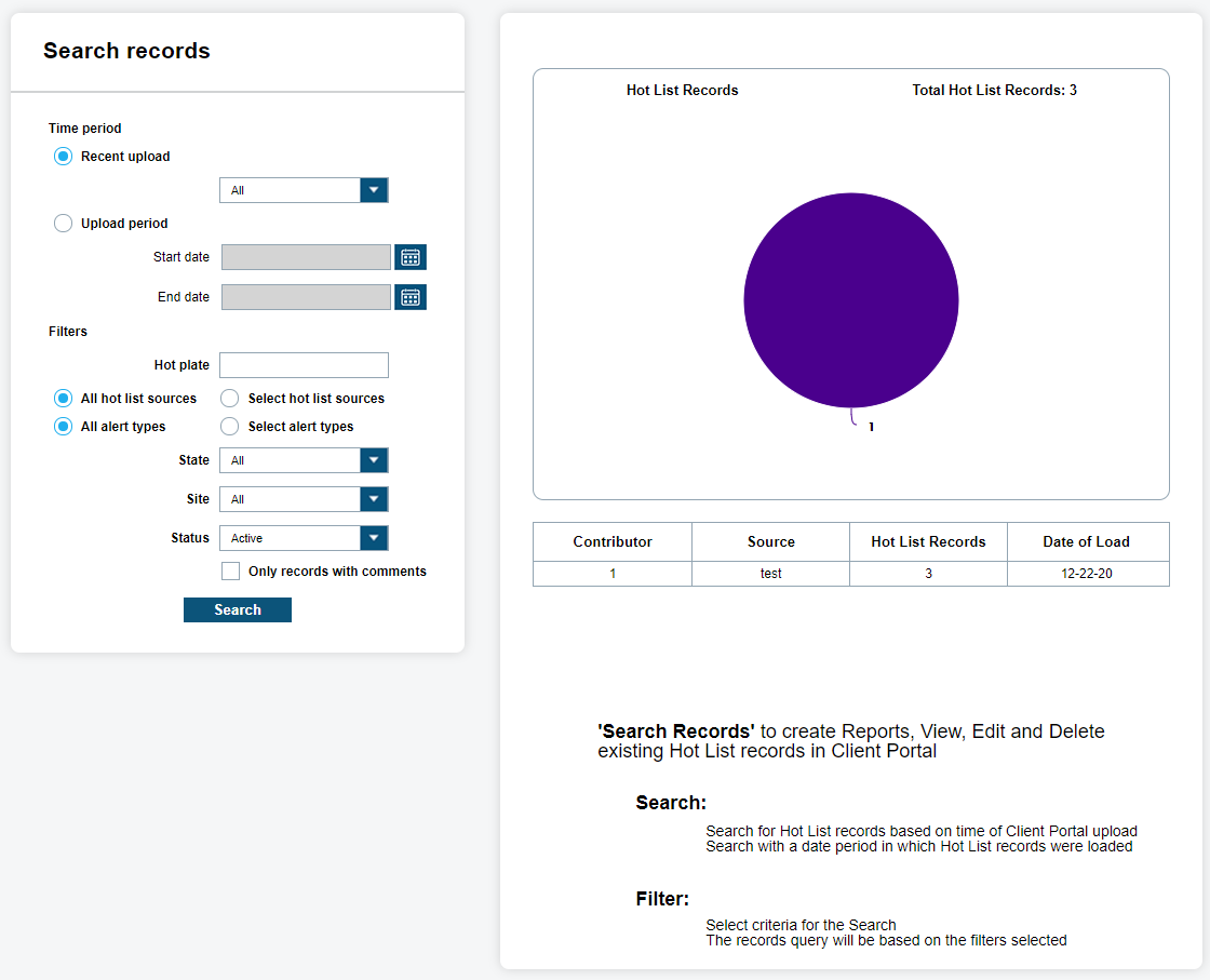 To be able to search for uploaded Hot List records, select , and then select Search Records. From there, you will be presented with Time Period and Filters to narrow down your desired results. You will also be presented with a Dashboard view of the total records listed for each Hot List Source. Within this dashboard, you will also be presented with the Total Hot List Records. This is the total Active records associated with all visible Hot Lists for the site manager that is logged into ClientPortal.
