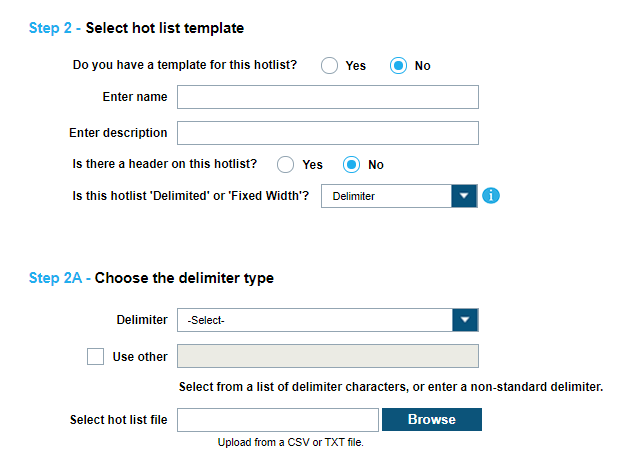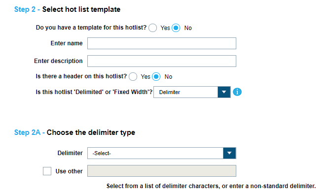 ClientPortal can select No if the template does not exists and begin the template creation process. First a Template Name is required, which is also used as the Source Name of the Hot List file. ClientPortal will want to enter a Hot List Template Description and define whether the file has a Header. Examine the Hot List file for a Header Row. This will be the first row of the Hot List. Select Yes or No based on if the Hot List has a Header Row. Lastly, ClientPortal will want to define whether the Hot List file is Delimited or Fixed Width. Indicate the method of data separation in the Hot List file as being Fixed Width or Delimiter. Delimited means that the columns are separated by a specific denoted character. Fixed Width means that the columns are separated by a specific number of characters for each column.