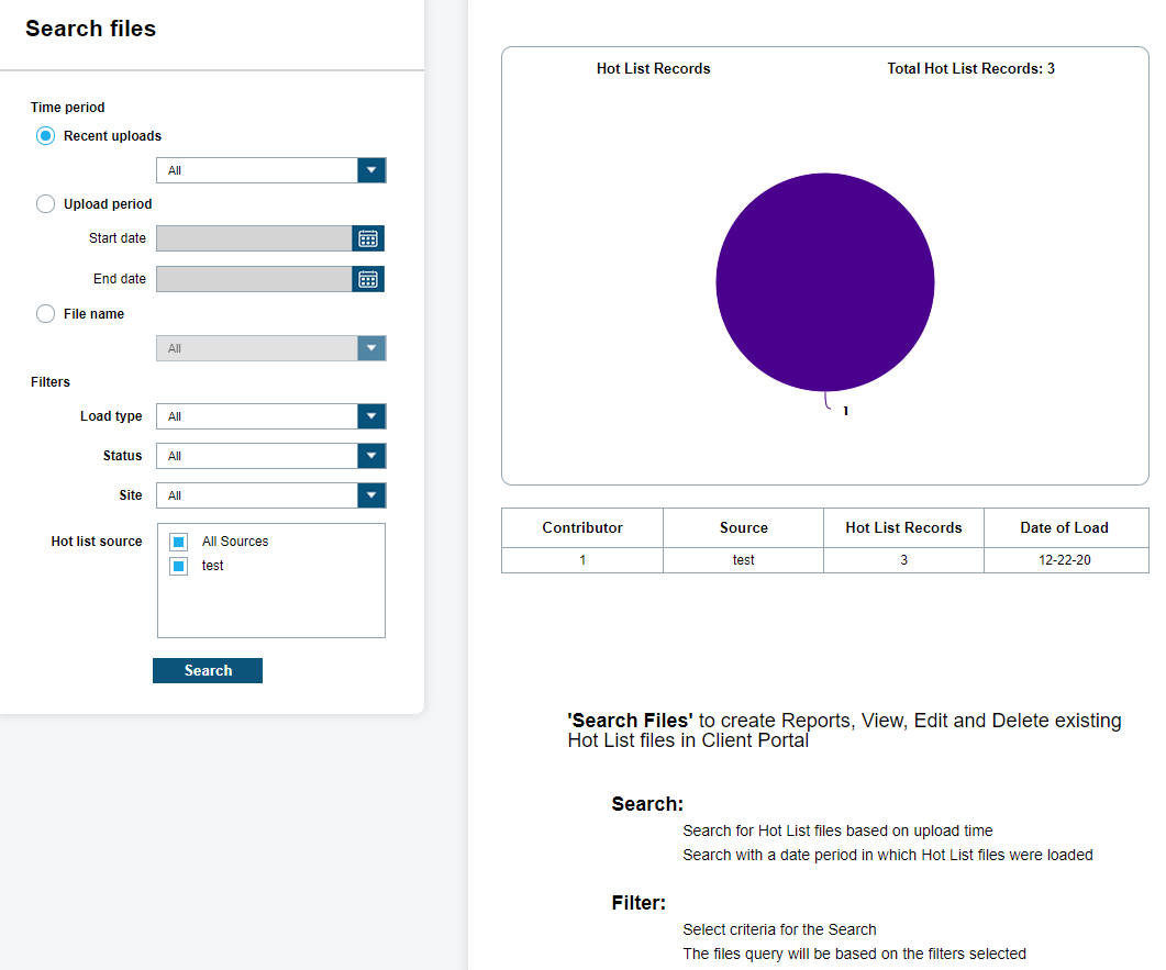 To be able to search for uploaded Hot List files, select tab, and then select Search Files. From there, you will be presented with Time Period and Filters to narrow down your desired results. You will also be presented with a Dashboard view of the total records listed for each Hot List Source. Within this dashboard, you will also be presented with the Total Hot List Records. This is the total Active records associated with all visible Hot Lists for the site manager that is logged into ClientPortal.