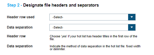 Examine the Hot List file for a Header Row. This will be the first row of the Hot List. Select Yes or No in the dropdown box based on if the Hot List has a Header Row. Next, ClientPortal must examine if the Hot List data is separated by a special character or if it is a Fixed Width. The best way to determine if it is Fixed Width is to count the number of characters in a row. If each row is identical in length, it could be Fixed Width. If you find the Hot List to be Delimiter separated, you will be prompted to select a character.