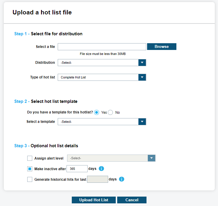 There is the option to Edit and Delete Hot List files. First, when you Edit a Hot List file, you can change the Distribution method from All Site users to Select users. You can also change when the Hot List becomes inactive by selecting the Make Inactive after … days option. You can also generate historical hits if this option was not originally selected on first upload. After making the changes, click Save.