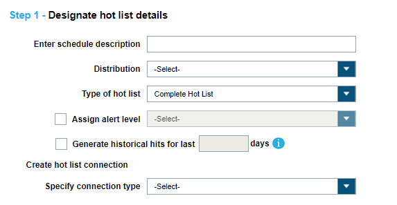 First, ClientPortal must give a description of the Schedule that will be used to look it up in the future (Example: Daily Local Warrants Hot List Upload). Then ClientPortal must define who will receive the Hot List using Distribution drop-down box. There are two options when assigning a Distribution of a Hot List to a Hot List data pool. First, ClientPortal is able to assign to All Site users. This option will add the Hot List to the Site-Wide Hot List data pool. The second option is to distribute to Select Users. This option will pull up a secondary dialog box to select individual users to receive the Hot Plate. This type of Hot List Distribution will define the Hot List as a user-Type Hot List.