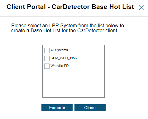 You will be presented with the option to select which systems to flag for a Base Hot List. Check the individual system box or check the All System box, and select Execute. You will be prompted to save the Base Hot-Hot List to a local drive. Once a system has been flagged for a Base Hot List, no new Hot Lists will distribute until the Base Hot List has been ported to the client.