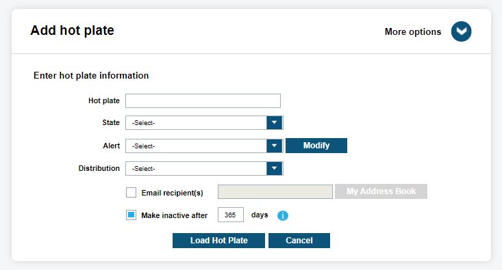 When adding a Hot Plate, ClientPortal has the option to make the record expire after a given period by selecting the Make Inactive after … days option. After a specified number of days, the record will become inactive but not be deleted. This allows for the record to become active again later. Also, there is the option to create hits from previous detections. When selecting Generate historical hits for last, ClientPortal can enter a specific amount of time to do historical hit look-ups. Essentially, this allows for the creation of hits of detections that are already on the system. This option can sometimes be useful for forensic data look-ups.