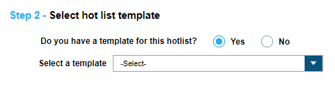 Before loading a Hot List, you must select a corresponding template. Once ClientPortal confirms that a template exists, you can select it from the Select a Template option. Simply select the desired template and choose Next. If the template is already being used by a different Auto Hot List or by a Shared Hot List, you will not see the template option. Only a single unique Template Source name can be assigned to an Site at any given time.