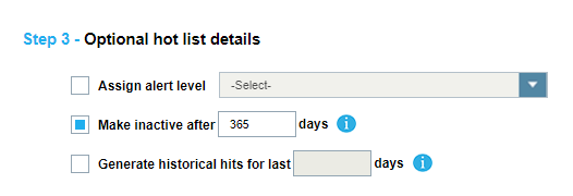 When ClientPortal assigns the optional field Alert Level, ClientPortal can define whether the Hot List alert is High, Medium, or Low. All the Records within the Hot List will receive the Alert Level defined and will show up with the hit Records. Client Portal has the option to make the record expire after a given period by selecting the Make Inactive after … days option. After a specified number of days, the records will become inactive but not be deleted. This allows for the record to become active again later. When selecting Generate historical hits for last, Client Portal can enter a specific amount of time to do historical hit look-ups. Essentially, this allows for the creation of hits from detections that are already on the ClientPortal server. This option can sometimes be useful for forensic data look-ups but is not needed.
