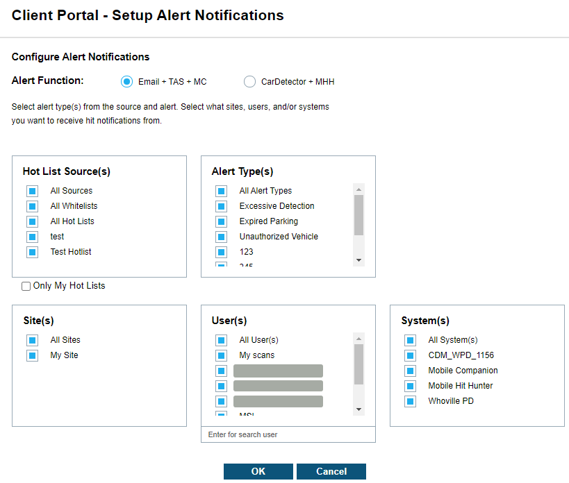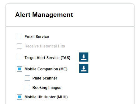 You can configure their Alert Management options if allowed by the manager. There are three main alerts allowed through Alert Management which consist of Email Service, Target Alert Service (TAS), and Mobile Companion (MC). A fourth alerting feature, Mobile Hit Hunter (MHH) can also be configured when applicable for the CarDetector Mobile System.